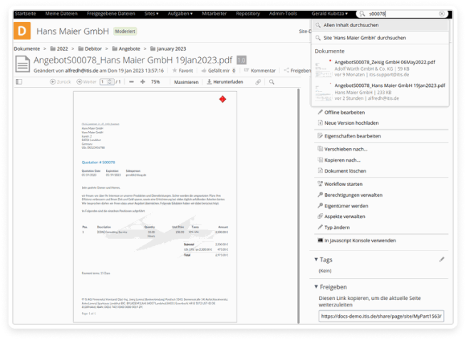 If you are looking for a specific document and know its title but are not sure where it was stored, simply enter the search term in the designated field, and ITISeasy.docs will provide you with the result in seconds.